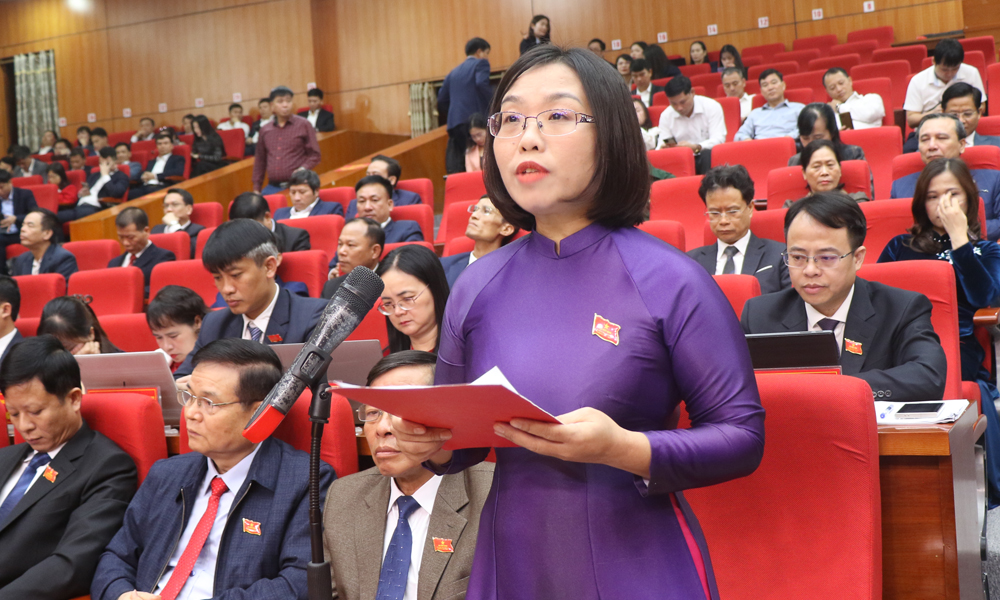 Đại biểu Phạm Thuỳ Trang, Phó Trưởng Ban Pháp chế HĐND tỉnh, Tổ đại biểu HĐND tỉnh số 13 phát biểu ý kiến. |