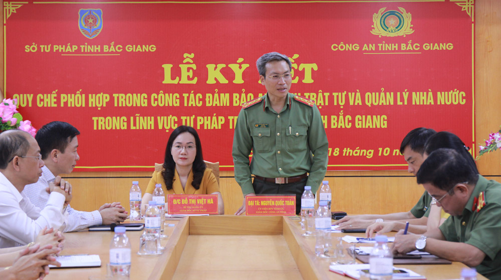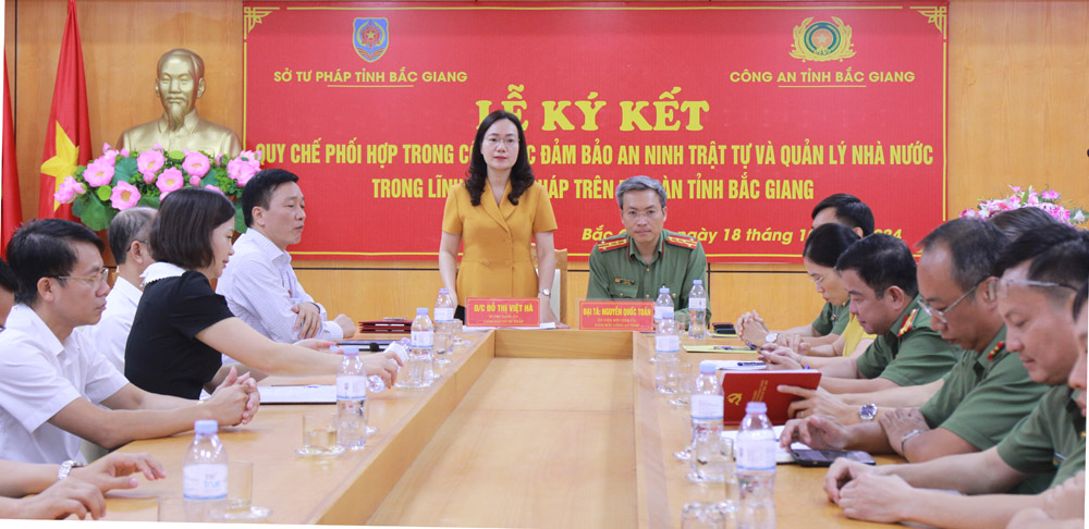 Phát biểu tại lễ ký kết, Đại tá Nguyễn Quốc Toản và đồng chí Đỗ Thị Việt Hà nhấn mạnh quy chế phối hợp trong công tác bảo đảm ANTT và quản lý nhà nước trong lĩnh vực tư pháp trên địa bàn tỉnh đánh dấu mốc mới trong việc đẩy mạnh phối hợp và chia sẻ thông tin giữa giữa Sở Tư pháp và Công an tỉnh trong thực hiện nhiệm vụ.