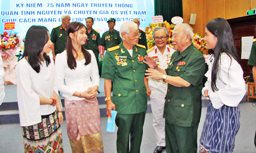Sinh viên tỉnh Xay Sổm Bun giao lưu với quân tình nguyện và chuyên gia quân sự tỉnh Bắc Ninh giúp cách mạng Lào. |