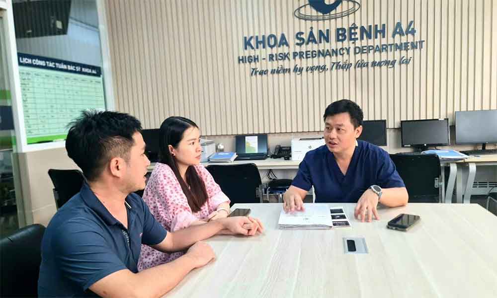 Bác sĩ Trương Minh Phương, Phó Trưởng Khoa Sản bệnh A4, Bệnh viện Phụ sản Hà Nội tư vấn cho hai vợ chồng sản phụ trước sinh. |