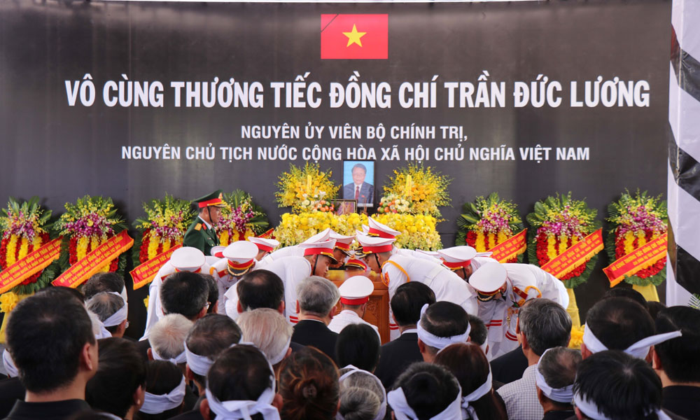 Trong niềm tiếc thương sâu sắc, các đồng chí lãnh đạo, nguyên lãnh đạo Đảng, Nhà nước, Mặt trận Tổ quốc Việt Nam, đồng chí, đồng bào và gia đình dành một phút mặc niệm vĩnh biệt đồng chí Trần Đức Lương - Nhà lãnh đạo có uy tín lớn, một tấm gương sáng về học tập, làm theo tư tưởng, đạo đức, phong cách Hồ Chí Minh, người đảng viên cộng sản kiên trung về nơi an nghỉ cuối cùng.