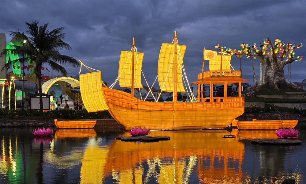 Không gian mặt đất tại đảo Ký ức Hội An cũng được thiết kế theo chủ đề “Châu Ấn Thuyền – Bức tranh di sản”, lấy cảm hứng từ giai đoạn hưng thịnh của thương cảng Hội An thế kỷ XVII. Hình ảnh Châu Ấn Thuyền (Shuinsen) – biểu tượng giao thương Việt Nam – Nhật Bản được tái hiện bằng hệ thống đèn lồng nghệ thuật quy mô lớn, kết hợp các hoạt động trưng bày làng nghề truyền thống, workshop trải nghiệm và minishow nghệ thuật.