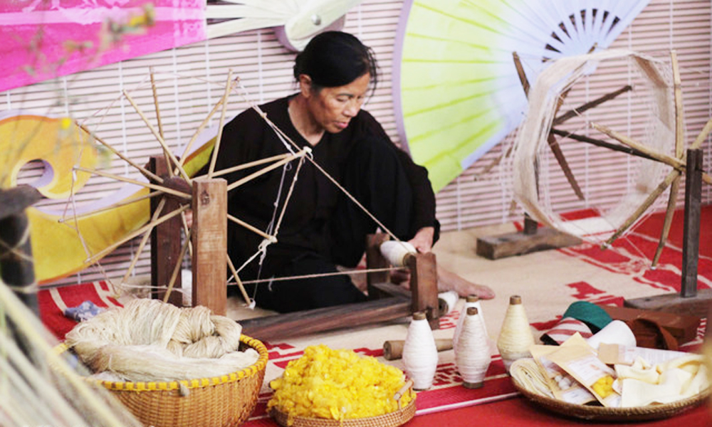 Nghệ nhân Việt Nam giới thiệu kỹ thuật se tơ truyền thống tại khu trưng bày làng nghề. |