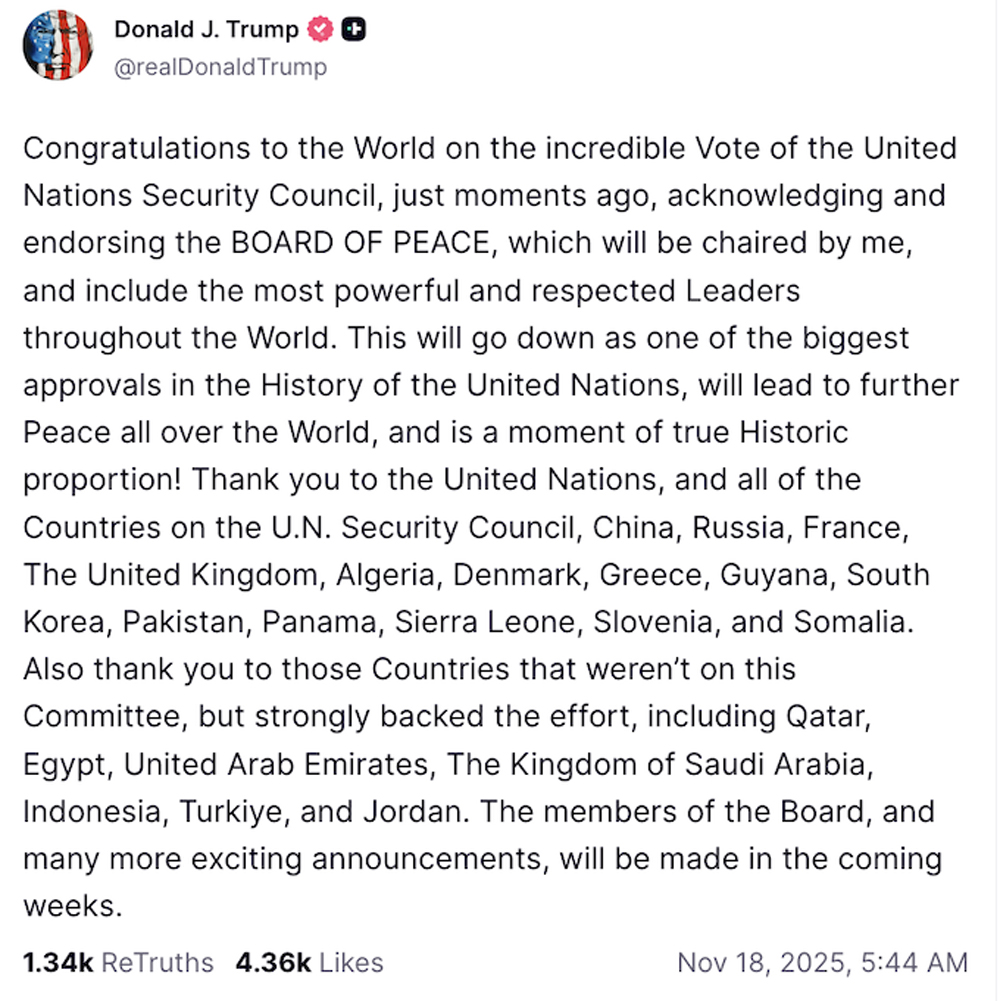 Hội đồng Bảo an Liên hợp quốc đã thông qua một kế hoạch của Mỹ dành cho Gaza, trong đó cho phép triển khai một lực lượng ổn định quốc tế nhằm bảo đảm an ninh cho vùng lãnh thổ bị tàn phá này, đồng thời phác thảo một con đường khả dĩ dẫn tới việc hình thành một Nhà nước Palestine độc lập trong tương lai.