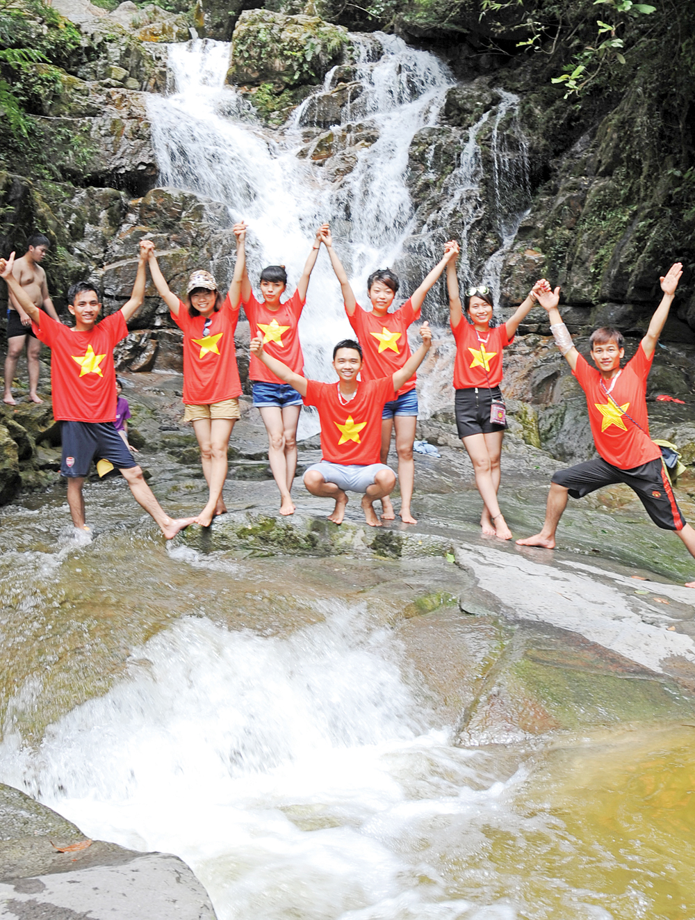 Du khách tại thắng cảnh thác Ba Tia, xã Tây Yên Tử. |