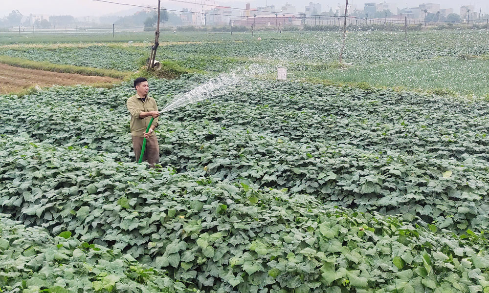 Để chủ động nguồn nước cho cây trồng, anh đầu tư kinh phí khoan giếng, dẫn điện phục vụ sản xuất ra tận ruộng. Dự kiến, trước Tết Nguyên đán tới, toàn bộ diện dích cây vụ đông của gia đình anh được thu hoạch, thu về hơn 60 triệu đồng. “Cùng với sản xuất cây vụ đông, trong năm tôi còn duy trì trồng nhiều loại cây trồng khác như: Dưa hấu, khoai sọ trên diện tích đất nông nghiệp của gia đình. Nhờ có kinh nghiệm chăm sóc, mỗi năm vợ chồng tôi thu về hơn 40 triệu đồng/sào từ các loại cây trồng khác nhau”, anh Nguyễn Đức Thắng chia sẻ.