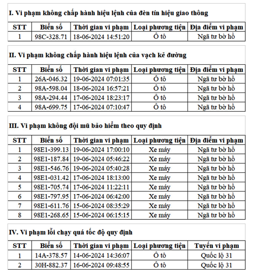 BẮC GIANG - Từ ngày 10 đến 24/6, thông qua hệ thống camera giám sát giao thông và thiết bị kỹ thuật nghiệp vụ, Công an huyện Lục Ngạn (Bắc Giang) phát hiện và thực hiện xử phạt “nguội” đối với 15 trường hợp vi phạm trật tự an toàn giao thông.