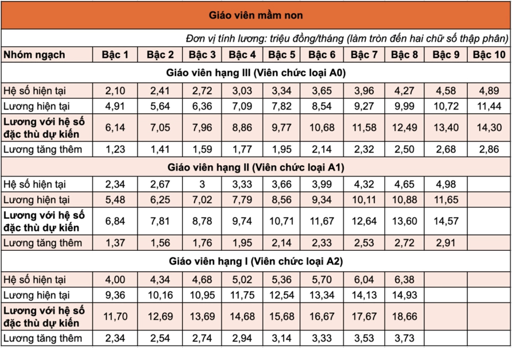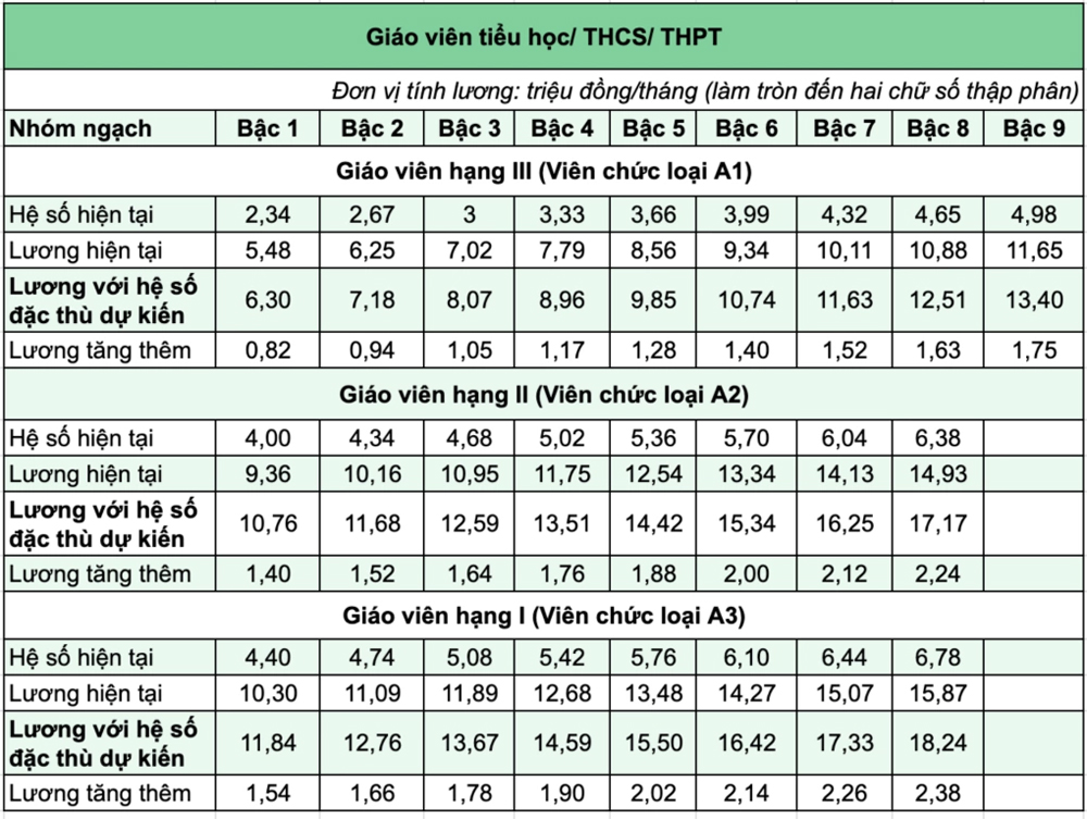 Bảng lương giáo viên mới với hệ số đặc thù dự kiến như sau: