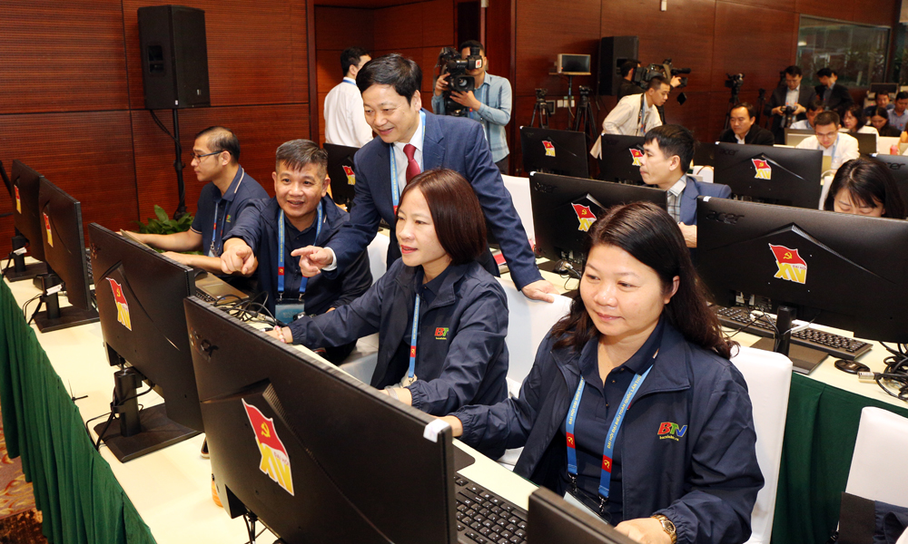 Phóng viên Báo và Phát thanh, Truyền hình Bắc Ninh tác nghiệp tại Trung tâm Báo chí Đại hội XIV của Đảng. |