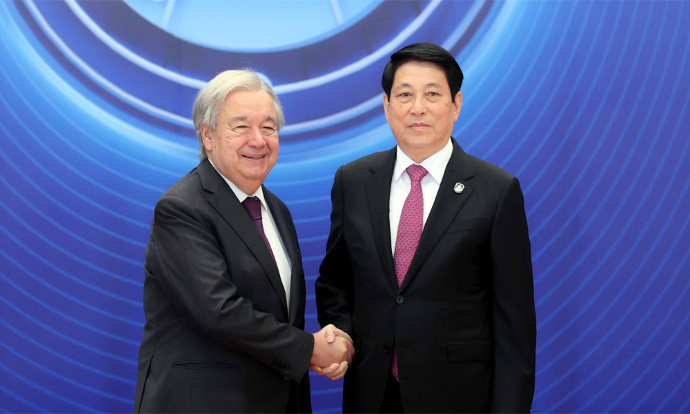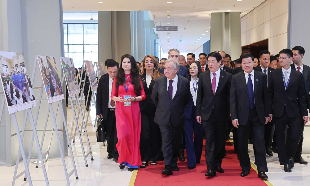 Chủ tịch nước Lương Cường và Tổng Thư ký Liên hợp quốc António Guterres cùng các Trưởng đoàn xem trưng bày ảnh do Thông tấn xã Việt Nam thực hiện.