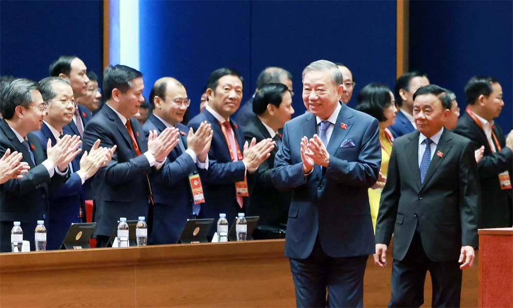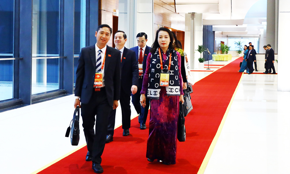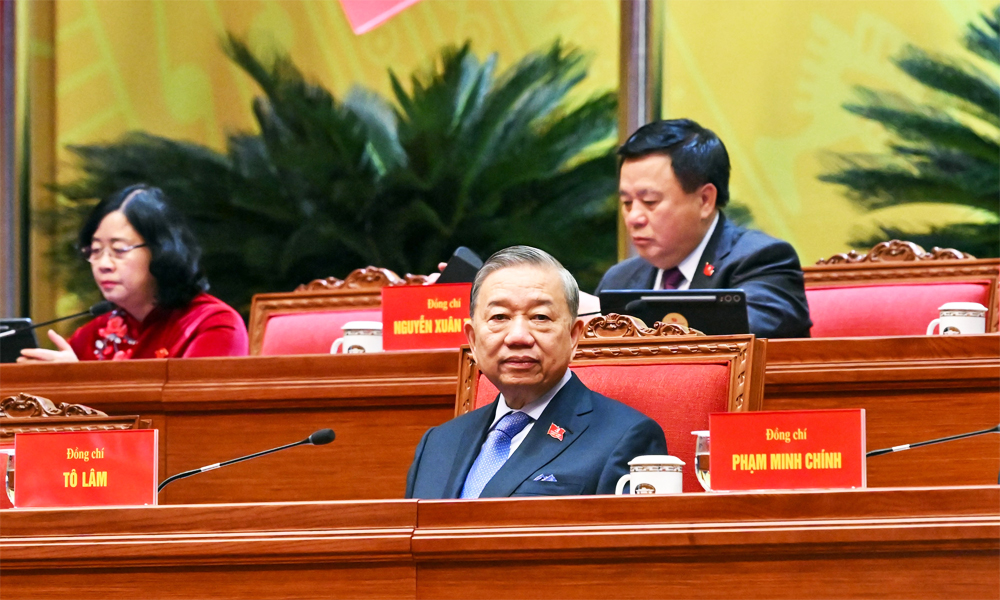 Tổng Bí thư Tô Lâm và Ủy viên Bộ Chính trị, Thường trực Ban Bí thư Trần Cẩm Tú đến dự phiên thảo luận tại hội trường về các văn kiện Đại hội, sáng 21/1. |