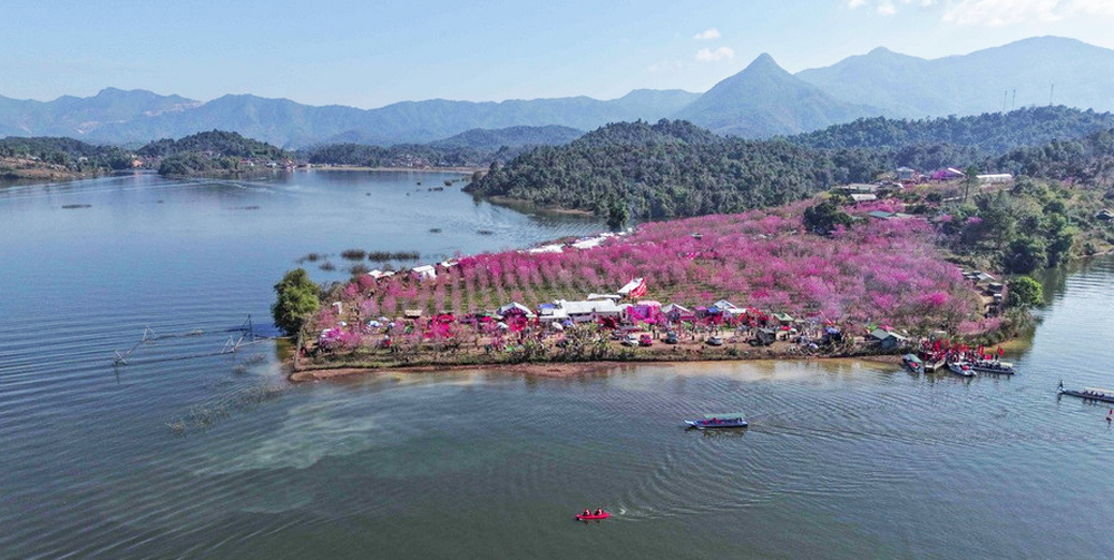 Đảo hoa anh đào bung nở rực rỡ giữa hồ Pá Khoang. |