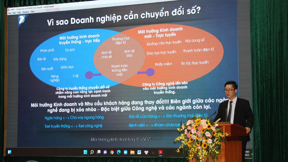 Đại diện Công ty Vina Solar Technology, KCN Vân Trung (Việt Yên) nêu câu hỏi tại hội nghị. |