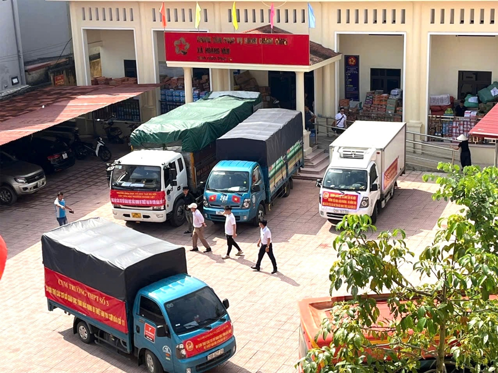 Hơn 70 xe ô tô chở trên 100 tấn hàng hóa thiết yếu gồm sách vở, đồ dùng học tập, máy tính, giày dép, quần áo và nhu yếu phẩm đã được Sở Giáo dục và Đào tạo Hà Nội cùng các trường học trên địa bàn thành phố trực tiếp vận chuyển tới xã Hoàng Vân để trao tặng chính quyền và các nhà trường.