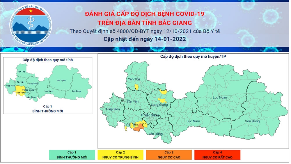 Đến 9 giờ ngày 14/1, toàn thành phố Hà Nội duy trì mức độ hai (vùng vàng), không có địa bàn quận, huyện nào ở cấp độ dịch 4 (vùng đỏ). Có 7 quận/huyện/thị xã cấp độ 3 (màu cam); 23 quận/huyện/thị xã cấp độ 2 (màu vàng).