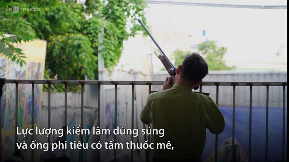 Lực lượng kiểm lâm dùng súng tẩm thuốc mê, bắn hạ hai con khỉ, mỗi con nặng khoảng 10 kg trong khu dân cư ở quận 12, chiều 15/1.