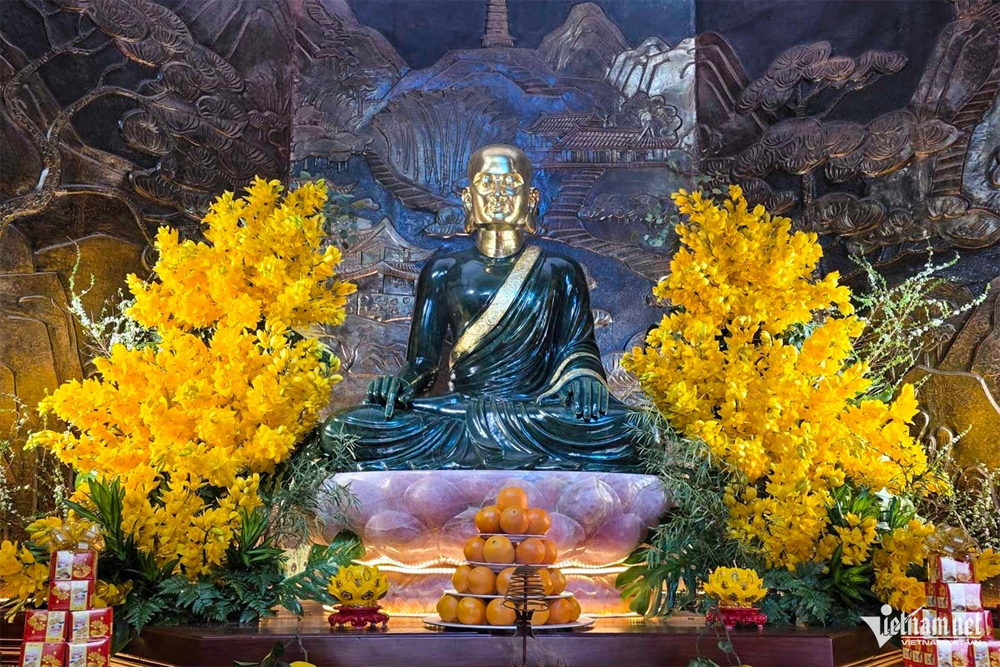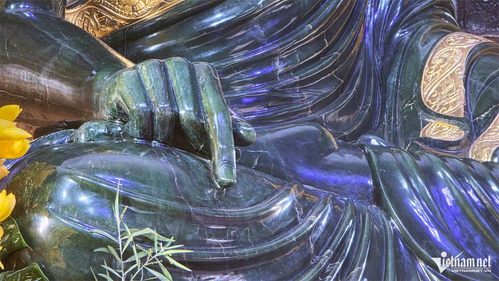 "Pho tượng được chế tác từ ngọc nguyên khối nặng hơn 8 tấn, có độ thuần khiết cao, được khai thác tại Cassiar (Canada). Trước khi được an vị tại đây, pho tượng đã được cung rước qua các ngôi chùa lớn như chùa Bái Đính, chùa Yên Tử, chùa Vĩnh Nghiêm và chùa Phật Tích", thượng tọa Thích Thanh Anh cho hay. |