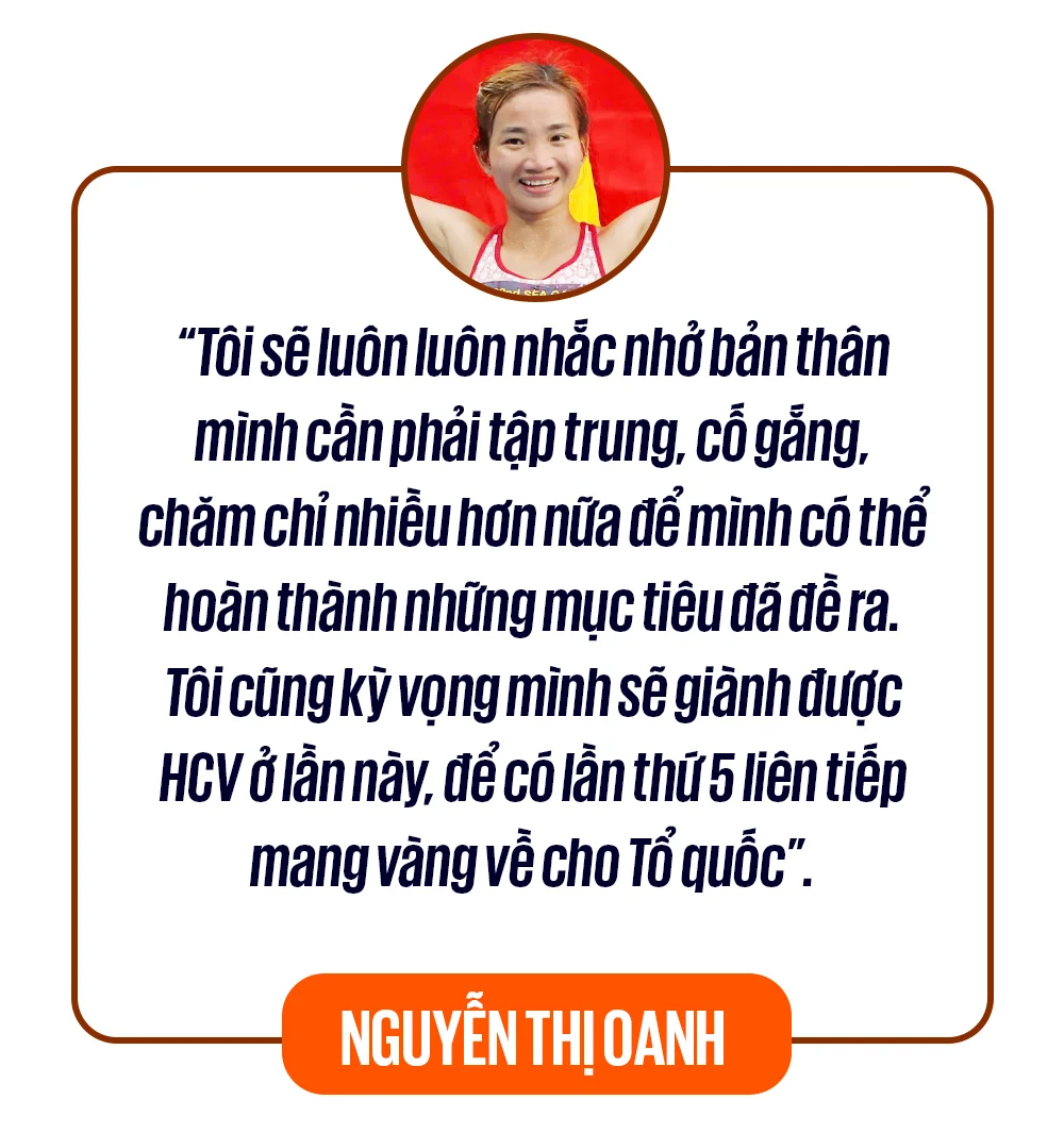 Sự khiêm tốn nhưng đầy quyết tâm ấy chính là vũ khí đáng sợ nhất của Oanh. Cô không chủ quan trước các đối thủ, luôn tôn trọng mọi cuộc đua. Với Oanh, SEA Games 33 không chỉ là cuộc đua thể lực mà là cuộc chiến của ý chí. Mục tiêu của cô rất rõ ràng: có lần thứ 5 liên tiếp giành vàng, một kỷ lục vô tiền khoáng hậu mà có lẽ rất lâu nữa điền kinh Đông Nam Á mới có người phá vỡ được.