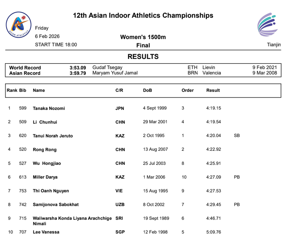 Tại Giải vô địch điền kinh châu Á trong nhà 2026 diễn ra ở Thiên Tân (Trung Quốc), vận động viên điền kinh Nguyễn Thị Oanh không thể tái hiện kỳ tích giành Huy chương Vàng như cách đây ba năm ở nội dung 1500m nữ.