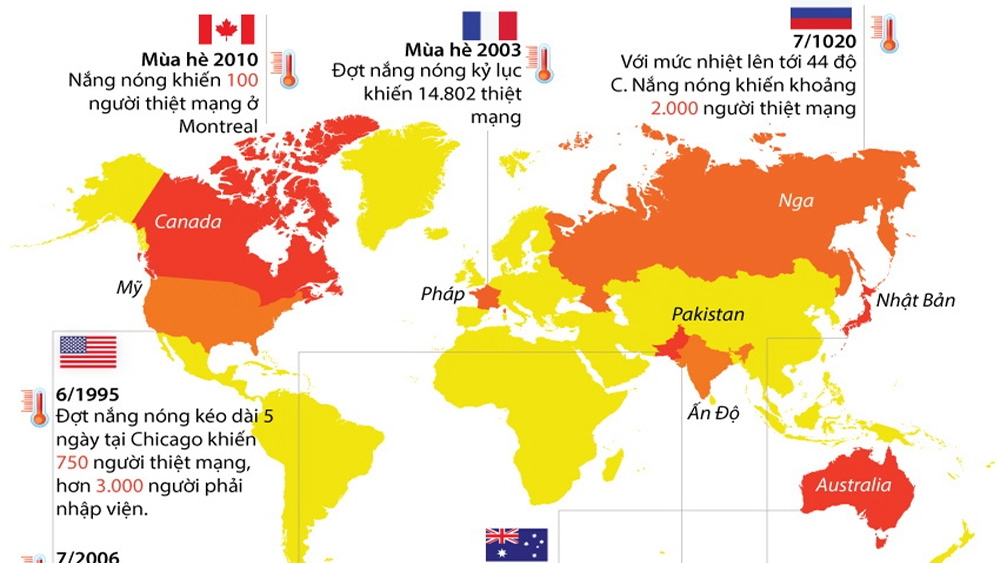 Đợt nắng nóng kéo dài trong thời gian qua đã khiến nhiệt độ tại một số địa phương ở Nhật Bản tăng lên mức kỷ lục. Nhiệt độ đo được trong chiều 6-8 tại TP Gero đã lên tới 41 độ C, đánh dấu mức nhiệt độ cao thứ 2 từng được ghi nhận tại Nhật Bản. Hôm 23-7, nhiệt độ tại Kumagay, thuộc tỉnh Saitama, gần thủ đô Tokyo, lên tới 41,1 độ C. Giới chức Nhật Bản đã khuyến cáo người dân bổ sung đủ chất lỏng, đặc biệt là những đồ uống chứa chất điện giải, hoặc dùng thêm chút muối khi uống nước.