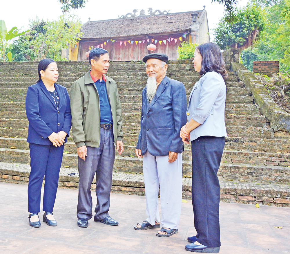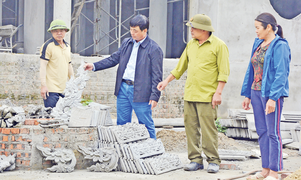 Đồng chí Dương Mạnh Cường (thứ hai bên trái) cùng các đồng chí trong cấp ủy Chi bộ kiểm tra tiến độ tôn tạo công trình chùa cổ của thôn. |