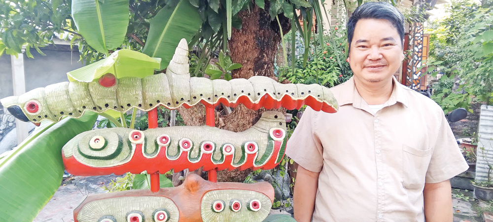 Nhà điều khắc Vũ Công Trí bên tác phẩm đoạt giải A về mỹ thuật toàn quốc. |