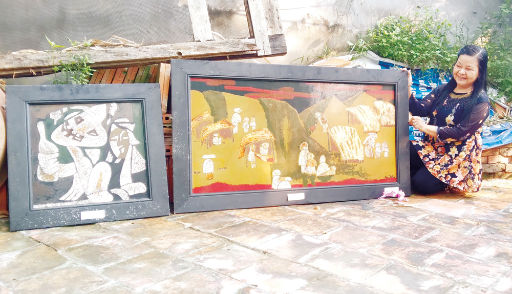 Họa sĩ Vũ Thị Thư bên tác phẩm của mình. |