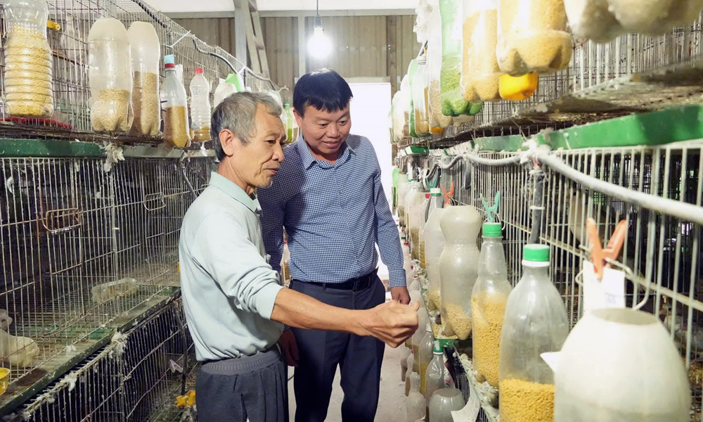Ông Nguyễn Mạnh Phong ở thôn Sâu, xã Tiên Lục giới thiệu quy trình chăn nuôi chim cu gáy trắng. |