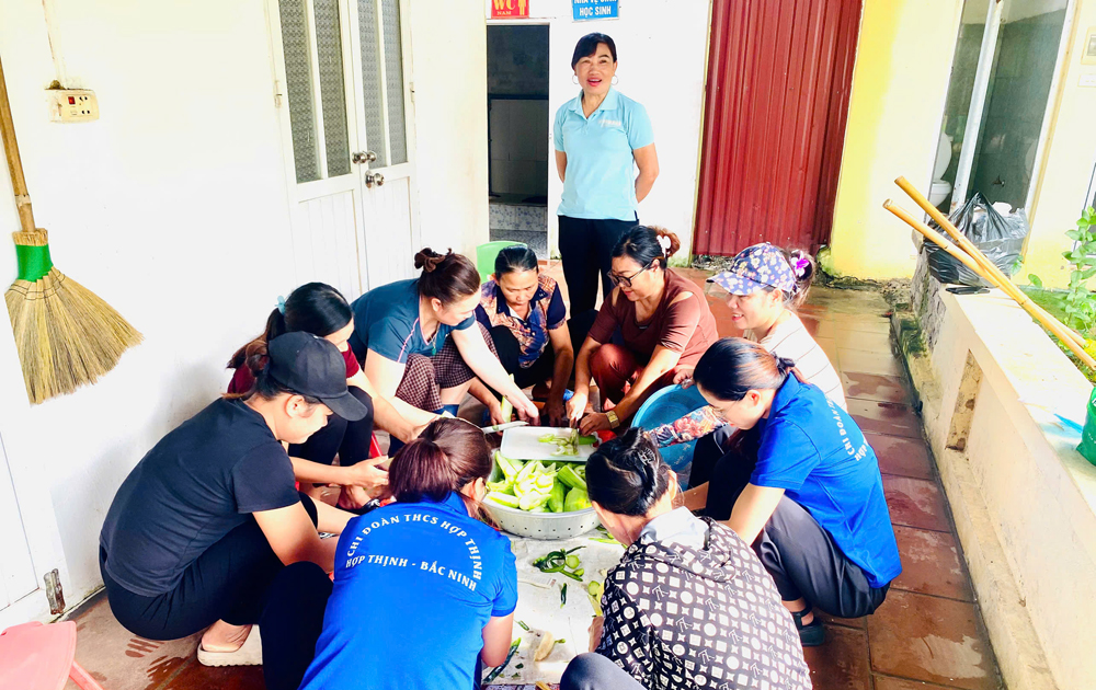 Giáo viên Trường Mầm non xã Hợp Thịnh chuẩn bị bữa ăn cho người dân vùng ngập lụt tạm trú. |