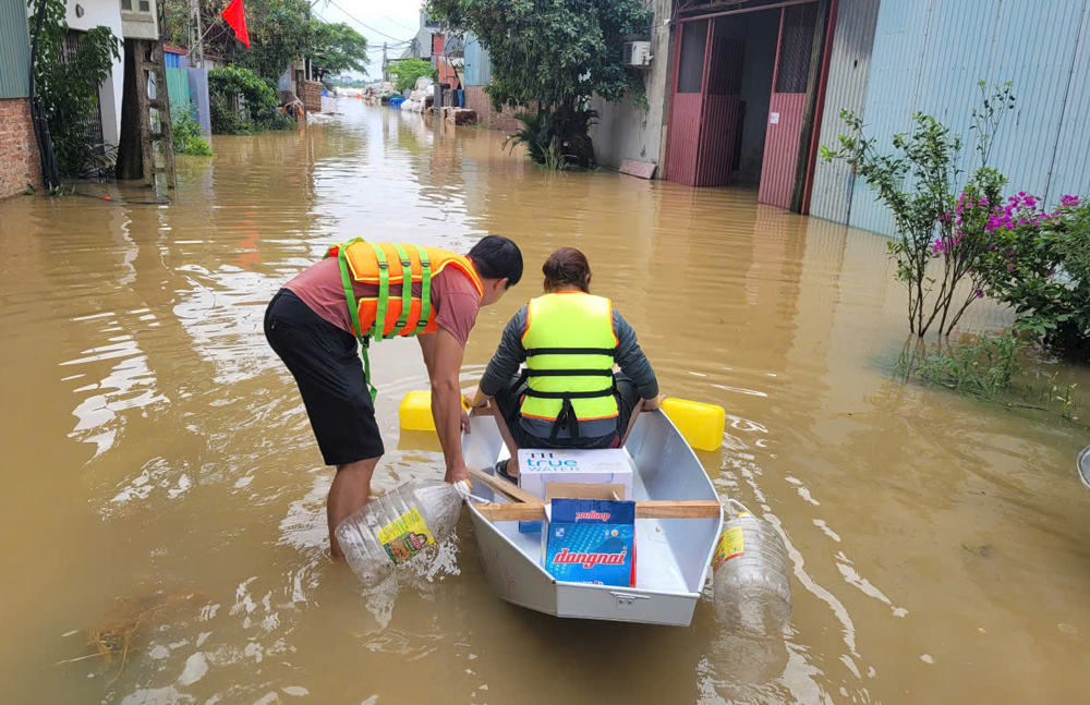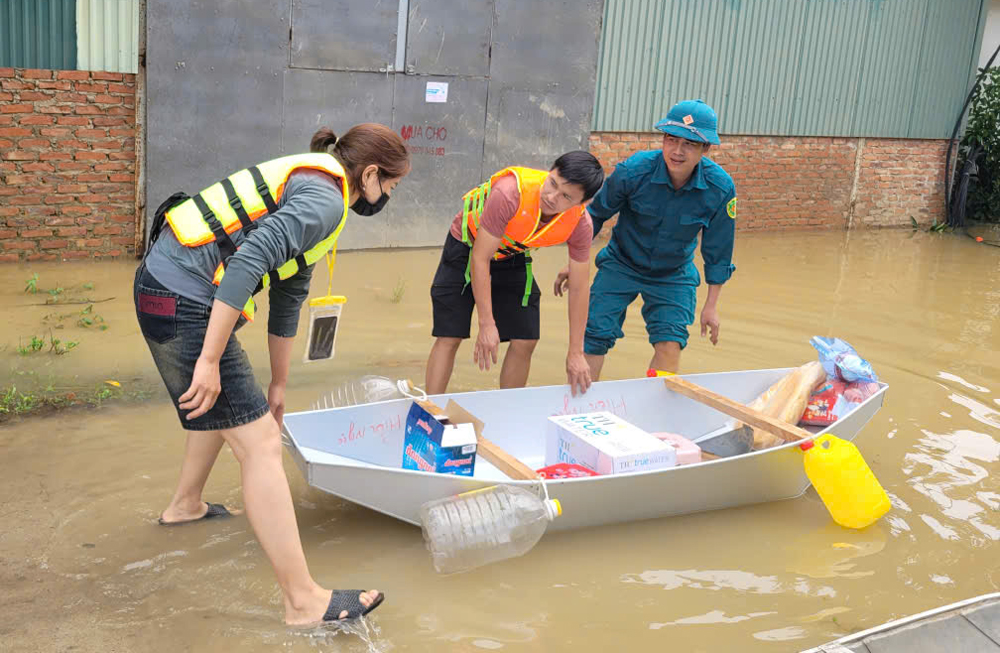 Lực lượng chức năng chuẩn bị nhu yếu phẩm cho các hộ dân vùng ngập lụt. |