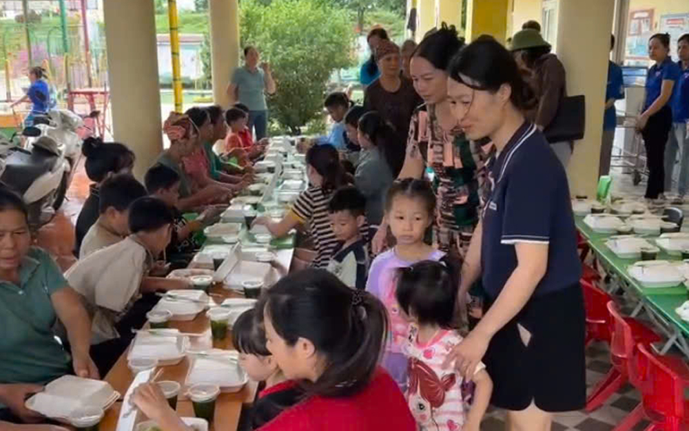 Người dân ăn trưa tại Trường Mầm non xã Hợp Thịnh. |
