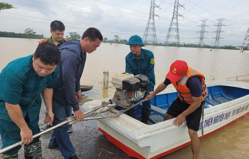 Chính quyền, lực lượng chức năng địa phương bố trí xuồng máy để tiếp tục di dời người già, trẻ nhỏ ra khỏi vùng ngập lụt. |