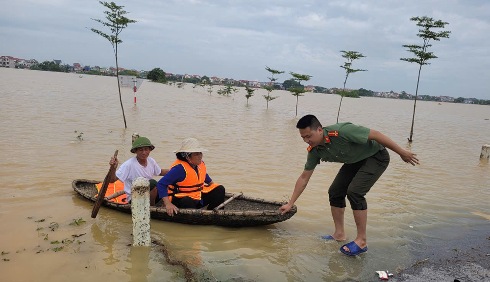 Huy động lực lượng hỗ trợ người già, trẻ em di dời khỏi vùng ngập lụt. |