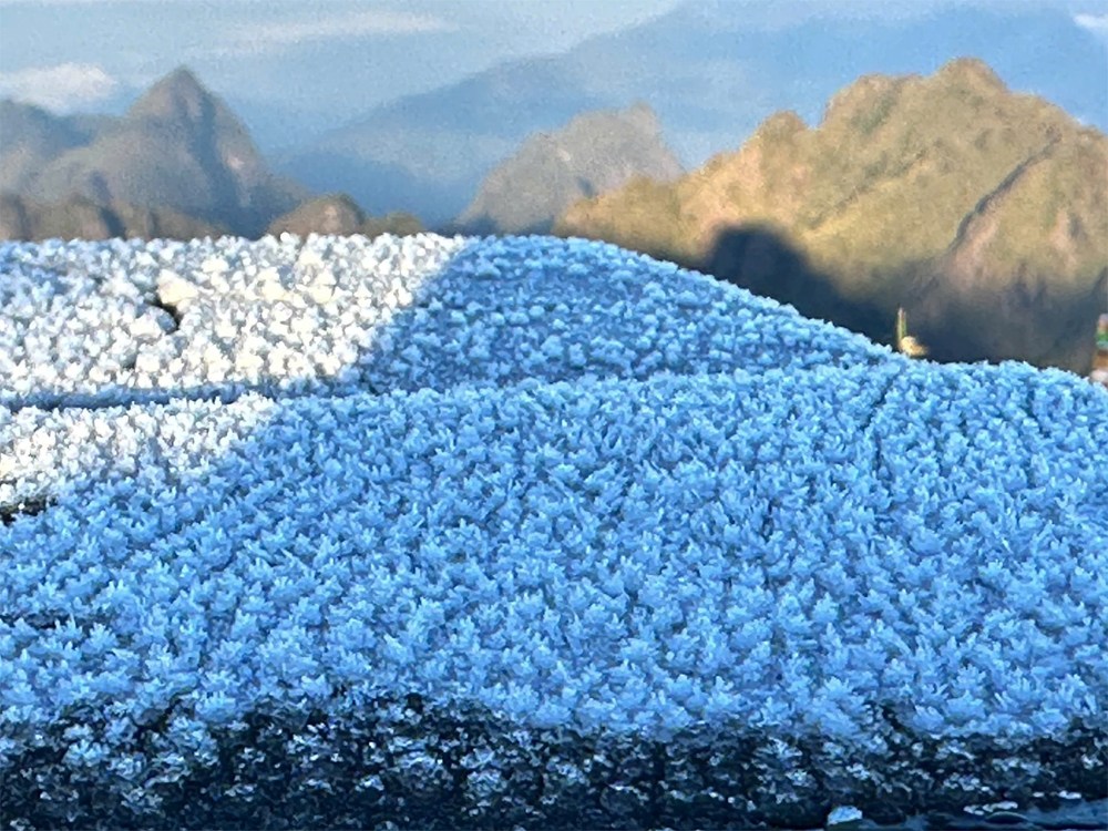 The ice layer, about 0.5 centimetres thick, clung to floors, railings, and other surfaces, turning the mountaintop into a shimmering white space with crystal-like formations. |