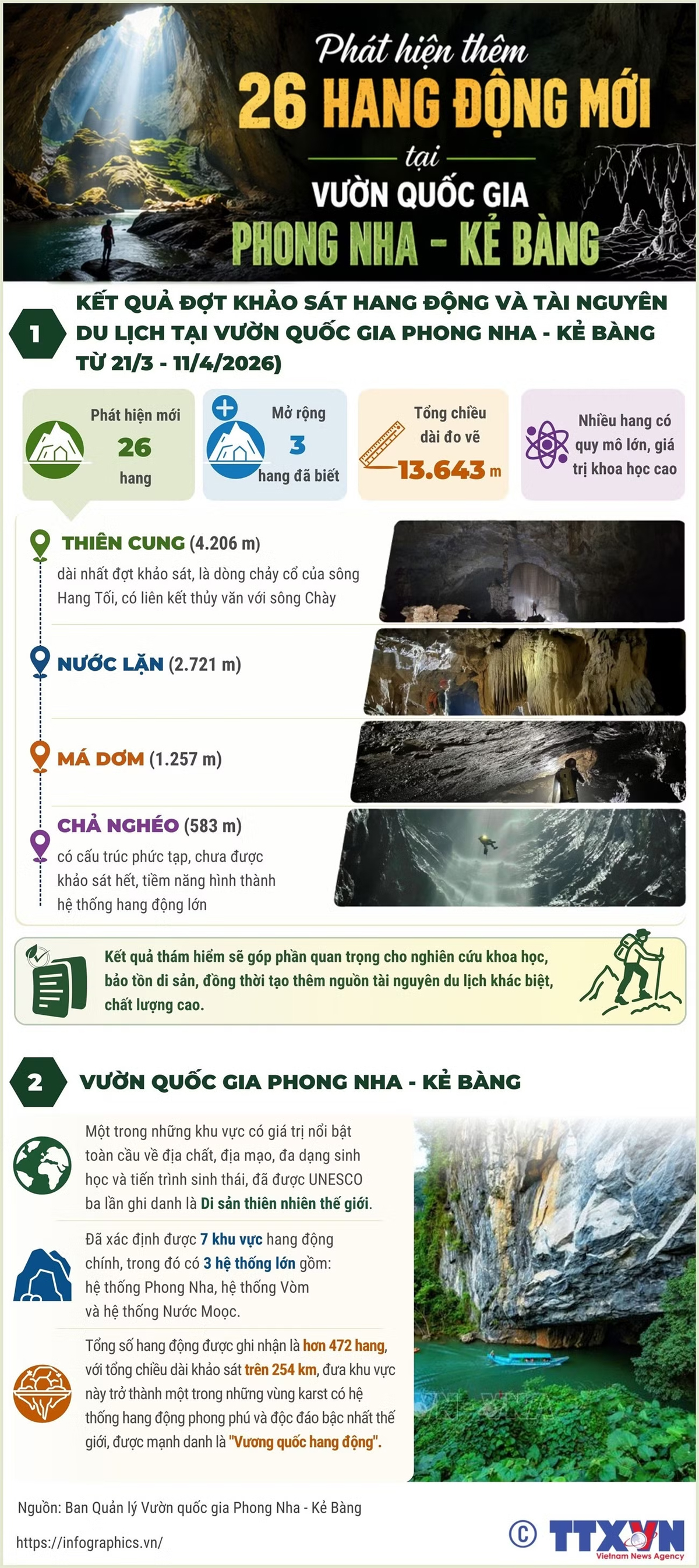 Kết quả khảo sát góp phần bổ sung cơ sở dữ liệu hang động, tiếp tục khẳng định giá trị nổi bật toàn cầu về địa chất, địa mạo của Di sản thiên nhiên thế giới Phong Nha-Kẻ Bàng, đồng thời mở ra cơ hội phát triển du lịch bền vững trong thời gian tới.
