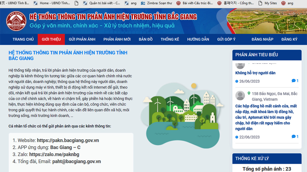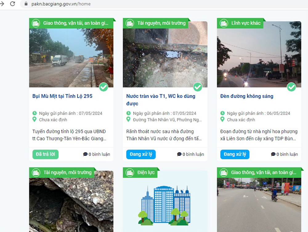 Từ khi đi vào hoạt động, nhiều kiến nghị, bức xúc đã được người dân, doanh nghiệp phản ánh đến chính quyền, lực lượng chức năng. Theo thống kê từ đầu tháng 7/2023 đến nay, hệ thống thông tin phản ánh hiện trường tỉnh đã tiếp nhận 313 ý kiến phản ánh ở các lĩnh vực: Tài nguyên - môi trường, giao thông - vận tải, an toàn giao thông, điện lực, xây dựng, thủ tục hành chính. Tỷ lệ ý kiến xử lý đúng hạn đạt 92,3%. Các đơn vị xử lý quá hạn là: UBND thị xã Việt Yên (9 ý kiến); UBND huyện Lạng Giang (2 ý kiến)...