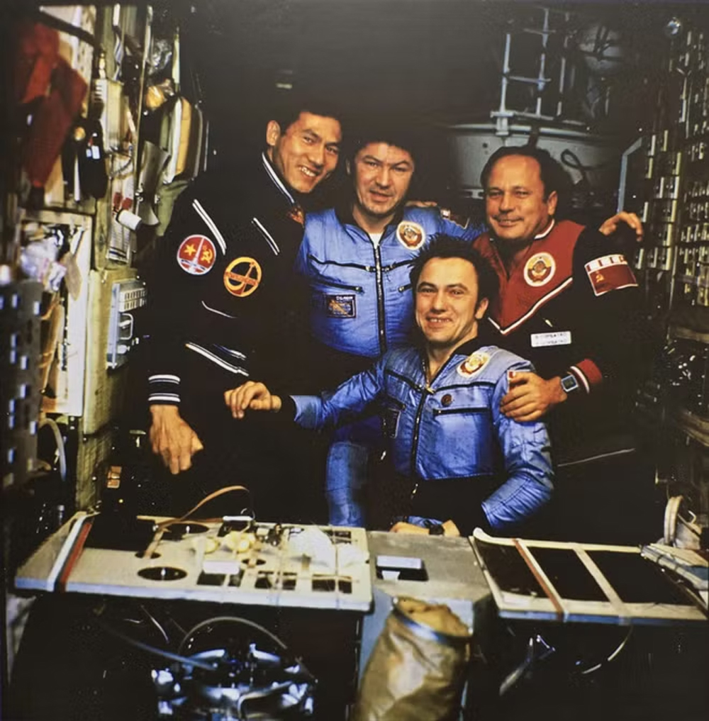 Các phi hành gia Viktor Gorbatko (áo đỏ), Phạm Tuân hội ngộ với Leonid Popov và Valery Ryumin trên trạm Salyut 6 chụp kỷ niệm. |