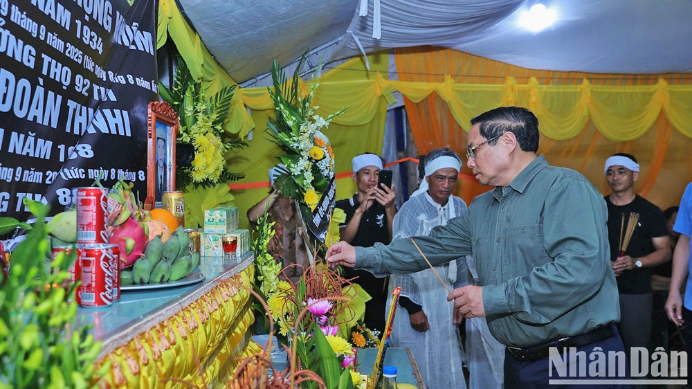 Thủ tướng Phạm Minh Chính thắp hương phúng viếng, chia buồn với thân nhân gia đình có 2 người bị thiệt mạng do ảnh hưởng của bão số 10 tại xã Quỹ Nhất, tỉnh Ninh Bình. |
