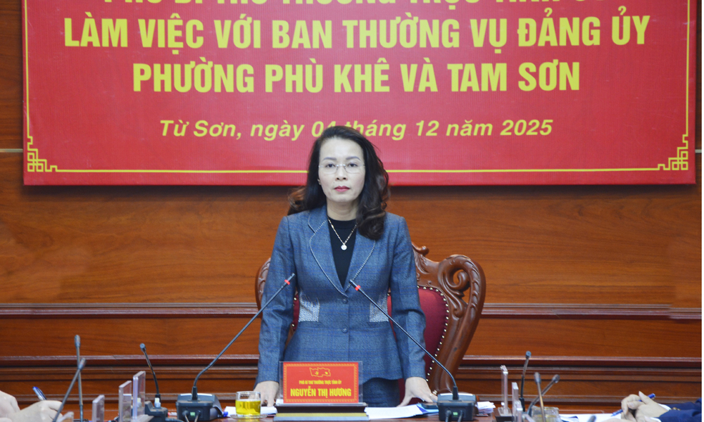 Phát biểu chỉ đạo tại đây, đồng chí Nguyễn Thị Hương đánh giá cao những kết quả 2 phường Tam Sơn và Phù Khê đạt được từ ngày 1/7/2025 đến nay, góp phần vào thực hiện tốt nhiệm vụ chính trị chung của tỉnh. Để thực hiện tốt nhiệm vụ đề ra trong thời gian tới, đồng chí Nguyễn Thị Hương yêu cầu Đảng ủy 2 phường tập trung vào một số nhiệm vụ trọng tâm: Tiếp tục triển khai thực hiện nghiêm các nghị quyết, chỉ thị, kết luận, quy định của Trung ương, của tỉnh về nâng cao hiệu quả hoạt động của hệ thống chính trị và mô hình chính quyền địa phương 2 cấp, đặc biệt là “bộ tứ nghị quyết trụ cột” của Bộ Chính trị và các nghị quyết, kết luận chuyên đề của Trung ương, các chương trình hành động, kế hoạch của Tỉnh ủy, Ban Thường vụ Tỉnh ủy thực hiện các Nghị quyết, nhằm nâng cao nhận thức và quyết tâm chính trị trong tổ chức thực hiện, tạo sự đồng thuận trong cán bộ đảng viên và Nhân dân.