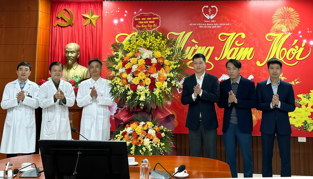 Đồng chí Trần Huy Phương tặng hoa chúc Tết tại Bệnh viện Đa khoa Bắc Ninh số 1. |