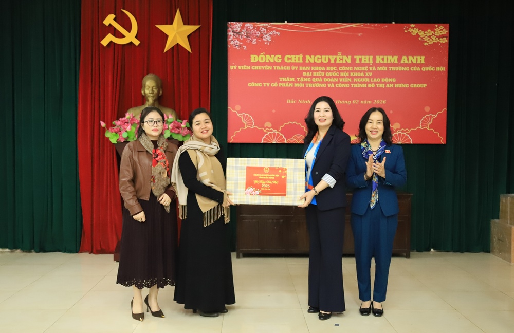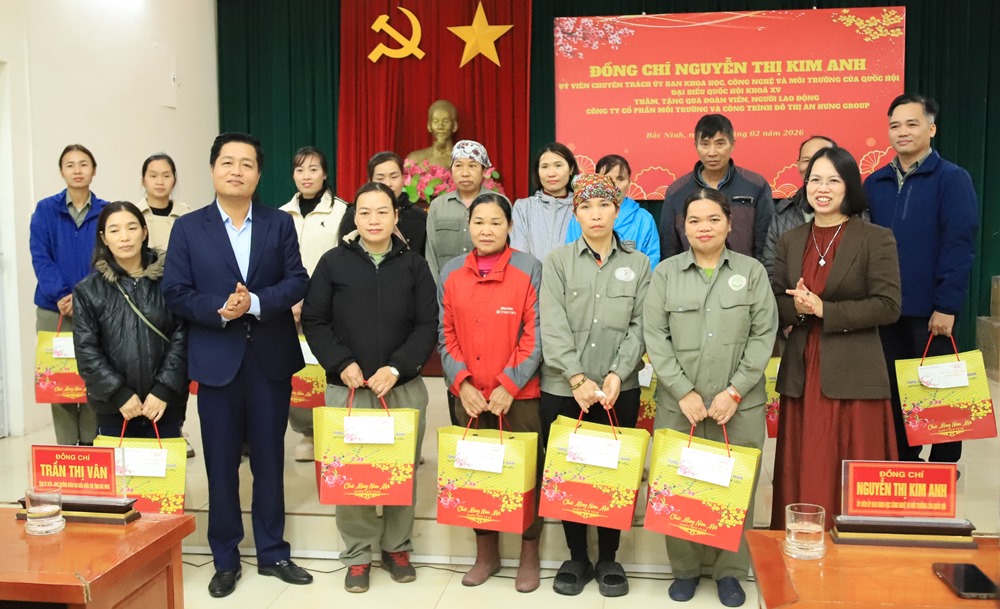 BẮC NINH - Ngày 11/2, đồng chí Nguyễn Thị Kim Anh, Ủy viên chuyên trách Ủy ban Khoa học, Công nghệ và Môi trường của Quốc hội thăm, chúc Tết và tặng quà công nhân, lao động hoàn cảnh khó khăn tại Công ty Cổ phần Môi trường và công trình đô thị An Hưng Group (phường Kinh Bắc). Cùng đi có đồng chí Trần Thị Vân, Tỉnh uỷ viên, Phó trưởng Đoàn Đại biểu Quốc hội tỉnh; đại diện lãnh đạo Ủy ban MTTQ tỉnh, Liên đoàn Lao động tỉnh.