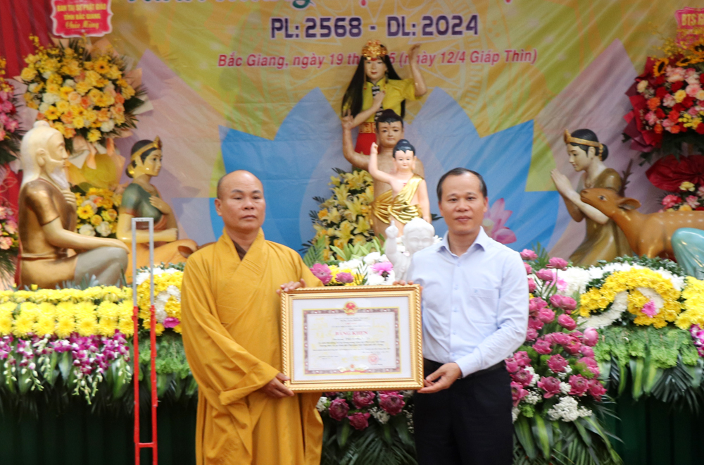 Tại đây, đồng chí Mai Sơn trao Bằng khen của Chủ tịch UBND tỉnh cho Hòa thượng Thích Thiện Văn do có nhiều thành tích trong thực hiện nhiệm vụ tại Tuần Văn hóa - Du lịch tỉnh Bắc Giang năm 2024. Đồng chí Trần Công Thắng trao thư chúc mừng của Ủy ban MTTQ tỉnh tới Giáo hội Phật giáo tỉnh Bắc Giang.