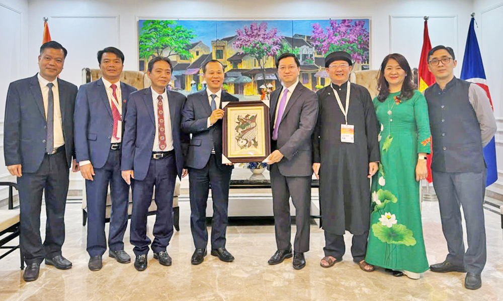 Đồng chí Mai Sơn và đoàn công tác trân trọng tặng tranh Đông Hồ cho Đại sứ Việt Nam tại Ấn Độ. |