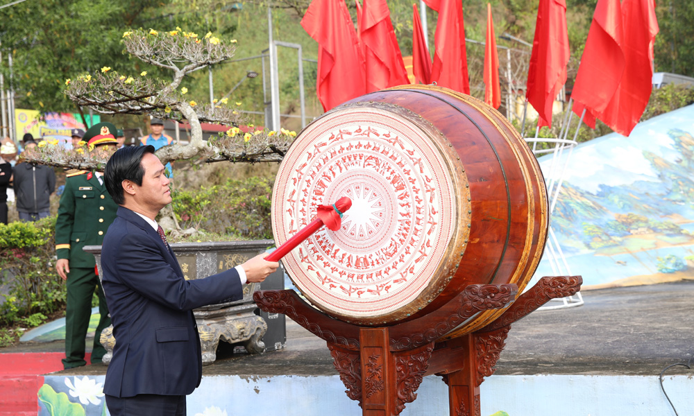 Đồng chí Lê Xuân Lợi nổi trống truyền thống tại lễ giao quân. |
