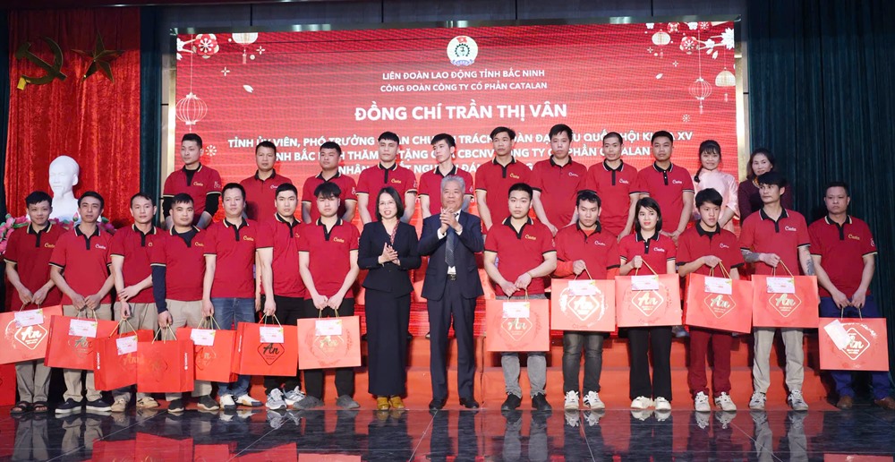 Lãnh đạo Liên đoàn Lao động tỉnh và Công ty cổ phần Catalan trao quà Tết cho công nhân. |