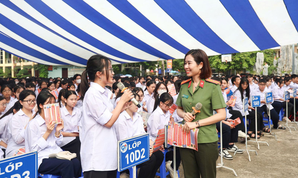 Cán bộ phòng An ninh mạng và phòng chống tội phạm sử dụng công nghệ cao tuyên truyền pháp luật cho học sinh. |