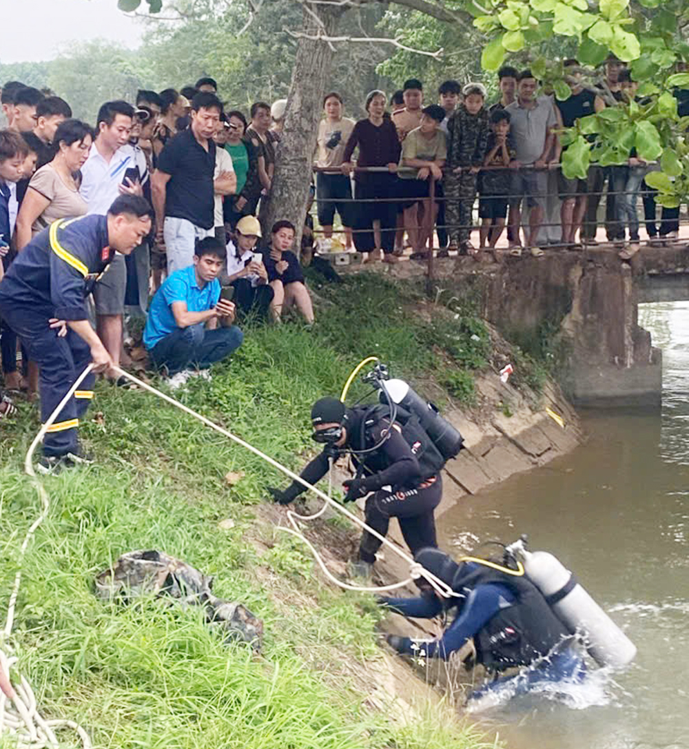 Cán bộ Đội Chữa cháy và cứu nạn, cứu hộ Khu vực Lạng Giang tìm kiếm nạn nhân đuối nước tại xã Lạng Giang. |