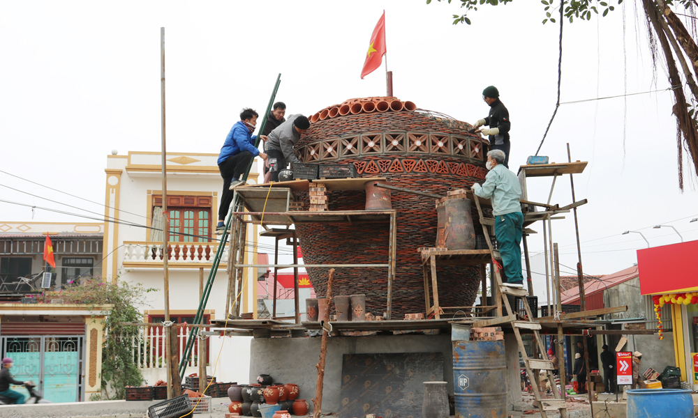 Những nghệ nhân, người thợ đang khẩn trương thi công chiếc chum gốm - biểu tượng của làng- bằng hàng nghìn mảnh gốm, lọ hoa nhỏ. |