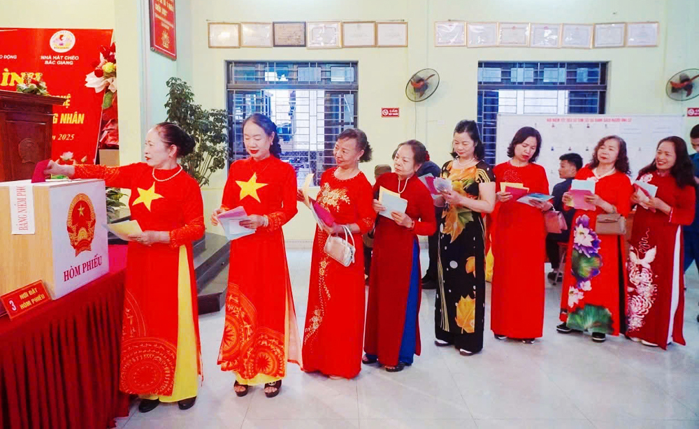 Tại các phường, xã: Bắc Giang, Kinh Bắc, Gia Bình, Cao Đức, Ngọc Thiện, Xuân Cẩm… phụ nữ các Tổ dân phố cùng nhau diện áo dài duyên dáng đi bầu cử. Còn các xã vùng cao như: Tây Yên Tử, Dương Hưu, An Lạc, Lục Sơn, Sơn Động… chị em lại rực rỡ trong trang phục truyền thống, có mặt tại điểm bỏ phiếu từ sớm. Bên cạnh việc thực hiện nghiêm túc quy trình “6 bước” theo hướng dẫn bầu cử, các hội viên nòng cốt tại cơ sở tích cực tham gia hướng dẫn cử tri thực hiện bầu cử và tuyên truyền về quy định bầu cử.