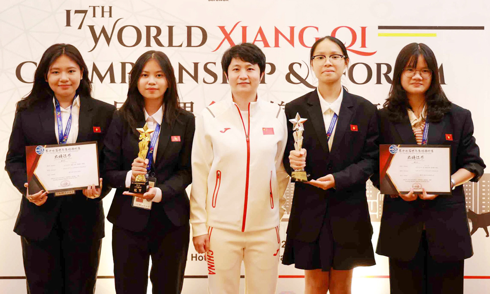 Kỳ thủ Phùng Bảo Quyên (thứ 2 từ phải qua) nhận HCB tại Giải Vô địch cờ tướng thế giới tổ chức tại Malaysia năm 2022. |